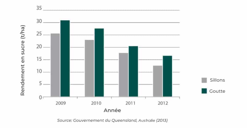 Le tableau ci-dessous montre l´impact de l´irrigation par goutte-à-goutte, en comparaison avec l´irrigation par inondation (sillons), pour la production de sucre en Australie.