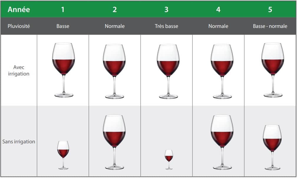Si l’humidité du sol issue des pluies d’hiver et de printemps est insuffisante et qu’aucune irrigation complémentaire n’est disponible, le risque de produire un vin de qualité inférieure augmente considérablement.