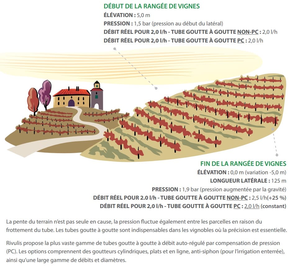 La variation de pression dans un vignoble ne dépend pas uniquement de la pente du terrain : elle peut également se produire à l’intérieur d’un même bloc, en raison des pertes de charge causées par le frottement des conduites. Dans les exploitations où la précision est essentielle, les lignes goutte à goutte à compensation de pression (PC) s’imposent comme une solution incontournable.