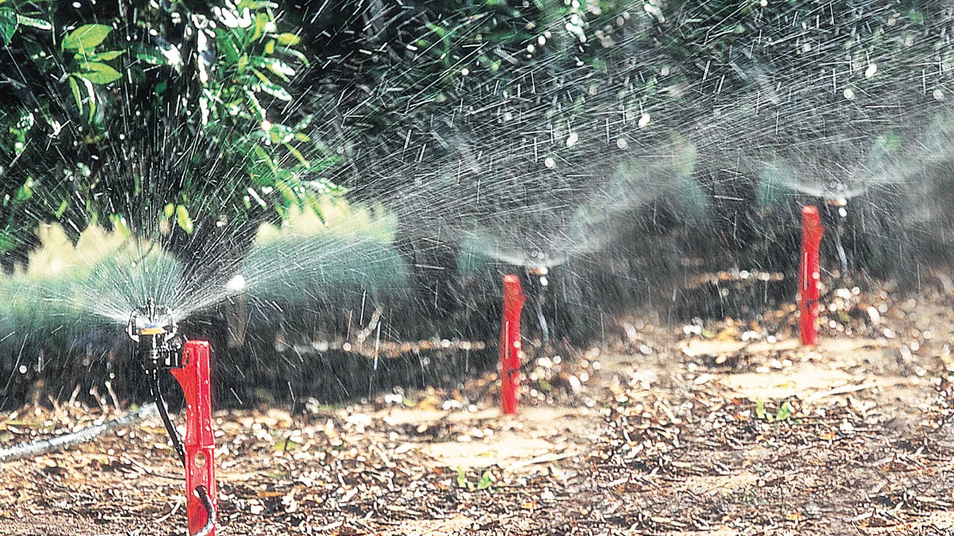Un système d’irrigation par aspersion permet d’appliquer de l’eau sous haute pression à l’aide d’une pompe. Il libère l’eau de manière similaire à la pluie à travers des buses de petit diamètre placées dans les tuyaux. L’eau est distribuée à travers un système de tuyaux et pulvérisée dans l’air, et irrigue bien la plupart des types de sol grâce à une large gamme de capacité de décharge.
