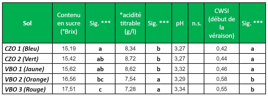 Table 1 : PARAMÈTRES DE QUALITÉ DES RAISINS À LA RÉCOLTE ET INDICE CWSI ( INDICE DE STRESS HYDRIQUE DES CULTURES) DÉTECTÉS DANS LES DIFFÉRENTES UNITÉS CARTOGRAPHIQUES